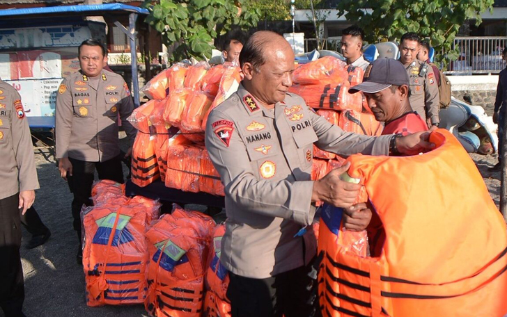 Kapolda Jatim juga memberikan rompi pelampung untuk keamanan serta bingkisan sembako untuk para nelayan.